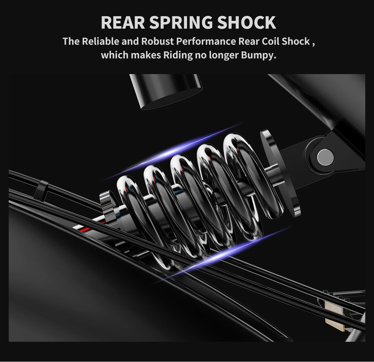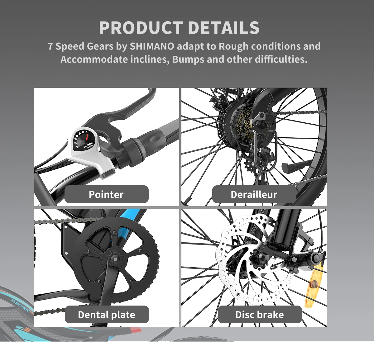 Our 500W electric bikes are equipped with headlight, dual mechanical disc brakes, 7-speed finger shifter & derailleur, shock-absorbing front fork,rear spring shock absorber