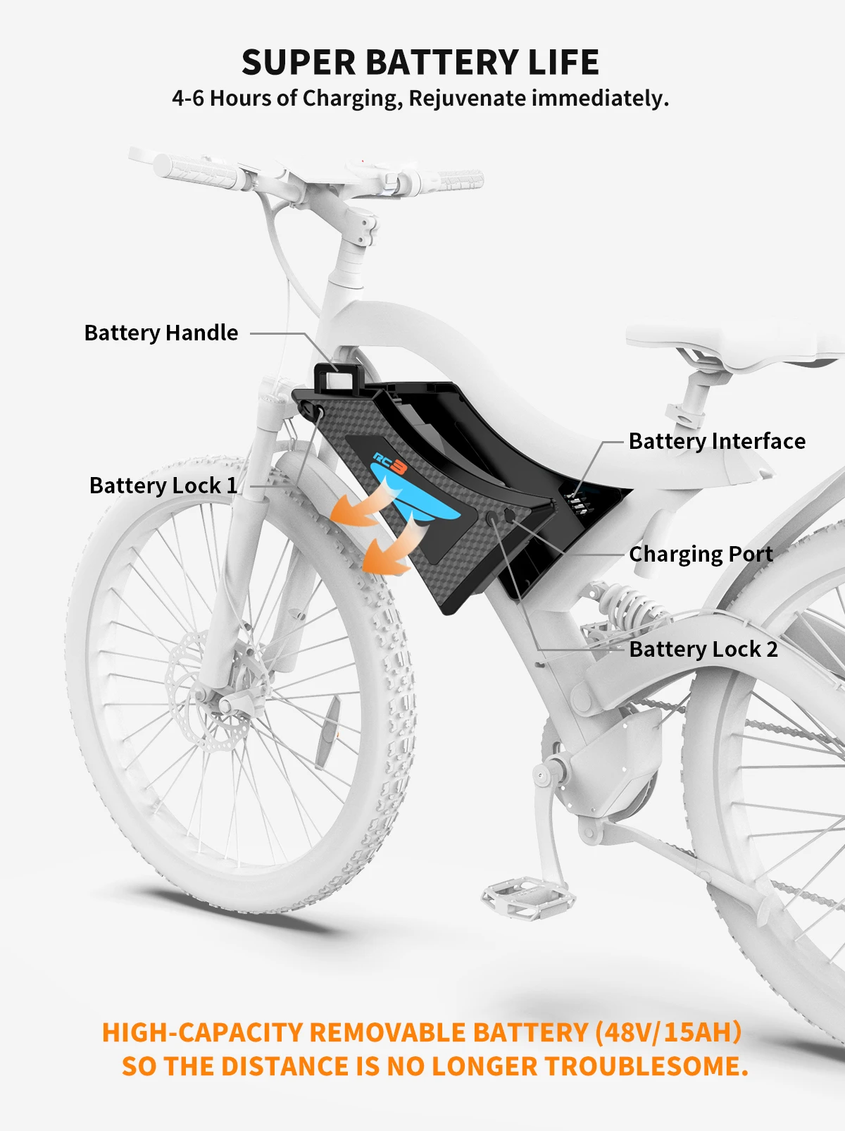 500W brushless motor provides strong power and can easily cope with small slopes; the maximum speed is 25mph, and the 48V15ah large-capacity lithium battery can support a riding distance of 20-35km (pure electric mode).