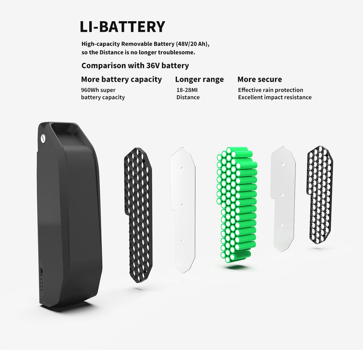 48V 20Ah high capacity lithium cell, supports long time riding.