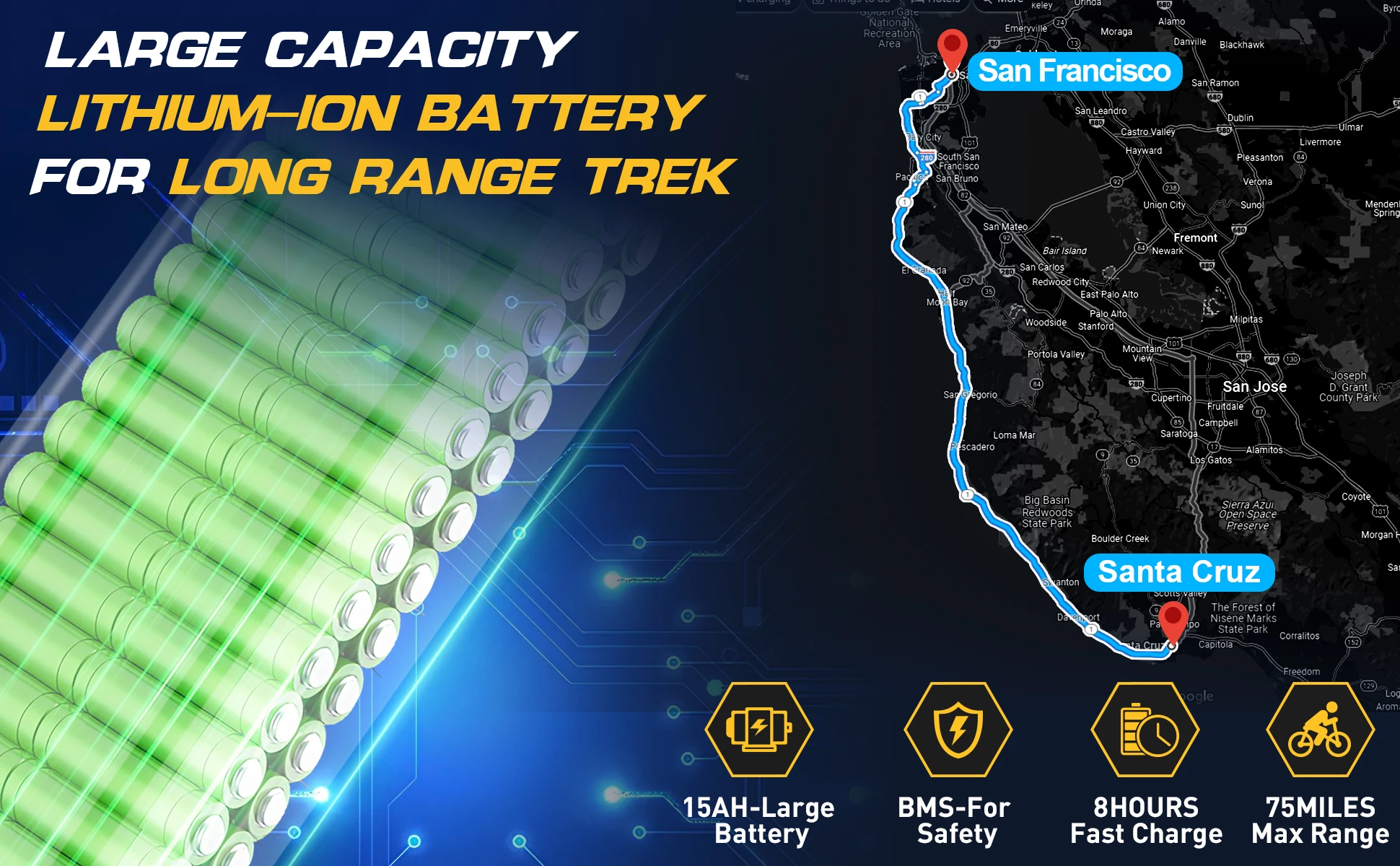 Waterproof Hidden Battery, this electric bicycle uses a 48V 15Ah IP54 waterproof lithium-ion battery hidden in the frame, fully charging takes 8-9 hours, and it can travel 25+ miles in pure electric mode and 75 miles in PAS mode.